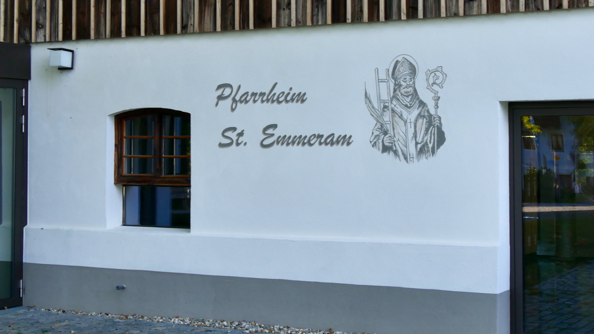 Deshalb hat die Kirchenverwaltung beherzt und tatenfreudig sich entschlossen, das Versehen des Architektenbüros Krug Grossmann zu heilen und am Pfarrheim in schwungvoller, schattierter Pinselschreibschrift-Typografie (Brush Script) die gut sichtbare Kennzeichnung „Pfarrheim St. Emmeram“ anzubringen, dazu auf der Seite des Haupteingangs ein passendes Porträt des Kirchenpatrons und Titelheiligen Emmeram nach historischer Holzstichvorlage, mit Bischofsstab, Märtyrerpalme und der Leiter als Marterwerkzeug.