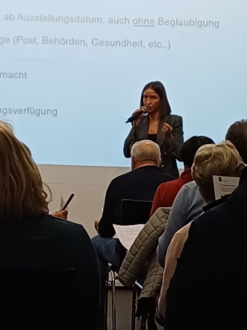 Ein besonderer Praxisbezug entstand dadurch, dass während der Veranstaltung Vordrucke zur Vorsorgevollmacht verteilt wurden. Frau Wörndl erklärte ausführlich, wie diese auszufüllen sind, welche Bereiche abgedeckt werden sollten und worauf besonders zu achten ist. Deutlich wurde dabei, dass die Vorsorgevollmacht das zentrale Instrument der persönlichen Vorsorge darstellt, da sie einer vertrauten Person umfassende Handlungsbefugnisse einräumt – etwa in Gesundheits- und Pflegefragen, bei finanziellen Angelegenheiten oder im Umgang mit Behörden.