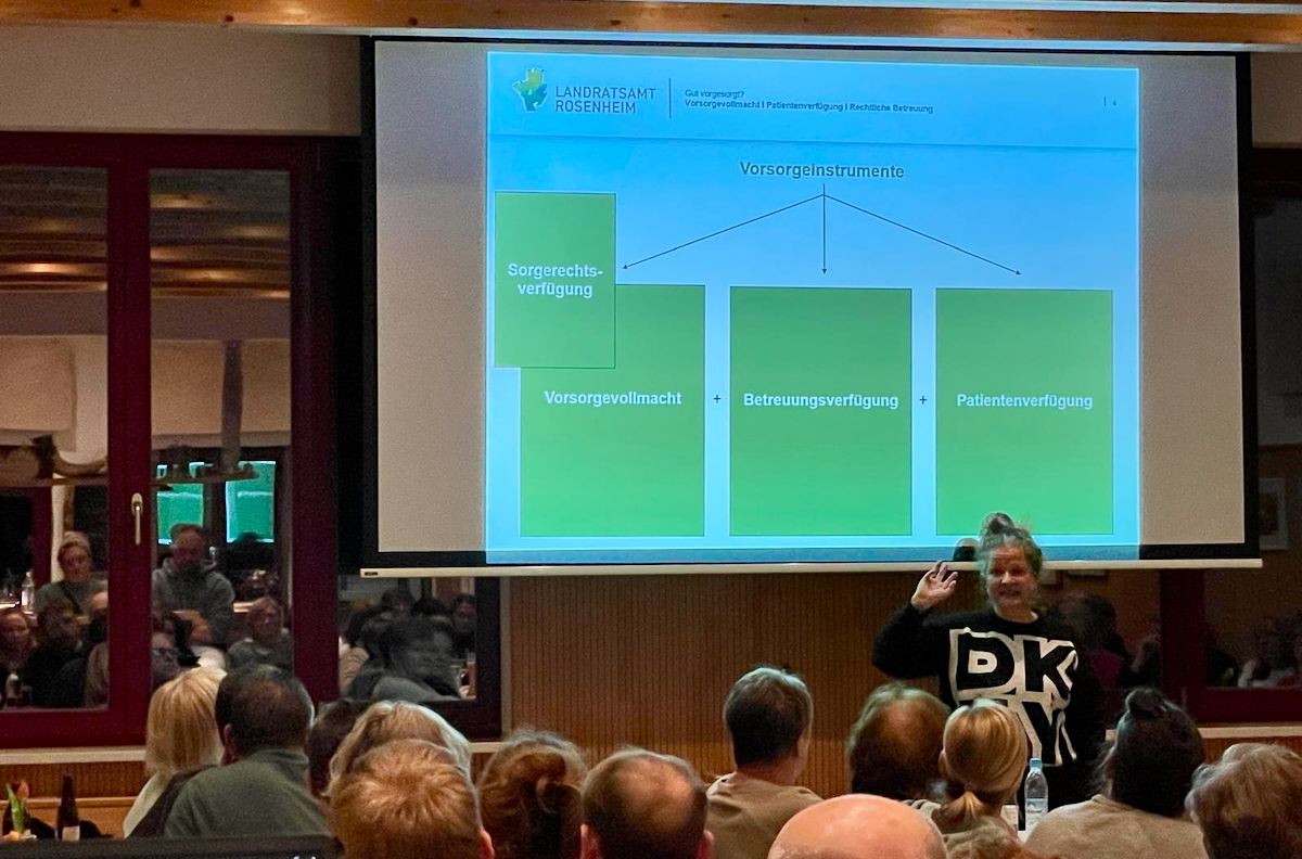 Frau Anne-Katrin Schulz von der Betreuungsstelle des Landratsamtes Rosenheim verstand es in beeindruckender Weise, komplexe rechtliche Inhalte verständlich, klar strukturiert und zugleich sehr einfühlsam zu vermitteln. Mit großer Fachkompetenz erklärte sie anschaulich die Unterschiede zwischen Vorsorgevollmacht und Patientenverfügung, zeigte auf, wann eine rechtliche Betreuung notwendig werden kann, und gab wertvolle Hinweise zur praktischen Umsetzung.