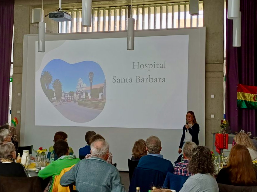 Nach dem Frühstück eröffnete Verena Dorn den informativen Teil des Vormittags. Sie berichtete von ihrem Freiwilligendienst, der von Volunta, einer Tochterorganisation des Deutschen Roten Kreuzes organisiert wurde. In ihrem eindrucksvollen Vortrag erzählte sie von ihrem Jahr in Bolivien. Darin schilderte sie Einblicke in das Alltagsleben, kulturelle Eindrücke und persönliche Erfahrungen, die sie während ihres Aufenthalts gesammelt hatte. Verena erzählte über die Geschichte des Landes, die Lage und die wichtigsten Städte Boliviens, die sie auf ihrer Reise besuchte, von La Paz über Potosí bis hin zu ihrem Endziel Sucre. Im dortigen Krankenhaus, dem Hospital Santa Barbara konnte sie intensive Einblicke in den dortigen Arbeitsalltag erhalten. Die auf 2800 m Höhe liegende Stadt beeindruckt mit einem großen Markt, einem lebendigen Zentrum und der Kathedrale auf dem Hauptplatz.