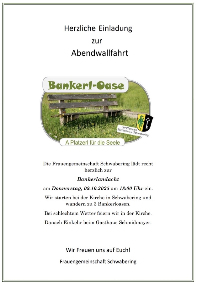 Die Frauengemeinschaft Schwabering lädt recht herzlich zur Bankerlandacht. Wir starten bei der Kirche in Schwabering und wandern zu drei Bankerl-Oasen. Bei schlechtem Wetter feiern wir in der Kirche. Danach Einkehr im Gasthaus Schmidmayer. Wir freuen uns auf euch!