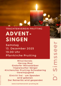 Es wirken mit: die Herzog-Musi, die Endorfer Weisenbläser, die Vogtareuther Sänger, der Kirchenchor Prutting-Schwabering und die Vereinsjugend. Eintritt frei – um Spenden wird gebeten. Der Reinerlös wird gespendet.