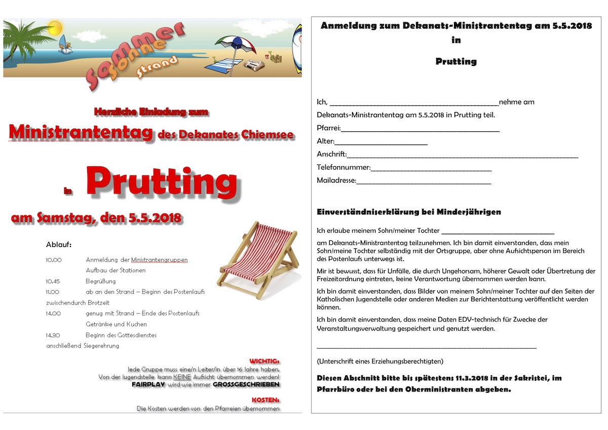 Wir würden uns freuen, wenn möglichst viele Ministranten dabei sind. Bitte die Anmeldefrist beachten und die vollständig ausgefüllten Anmeldungen bis spätestens 11. März 2018 in der Sakristei oder bei den Oberminis abgeben. Genaueres zum Tag geben wir noch bekannt.