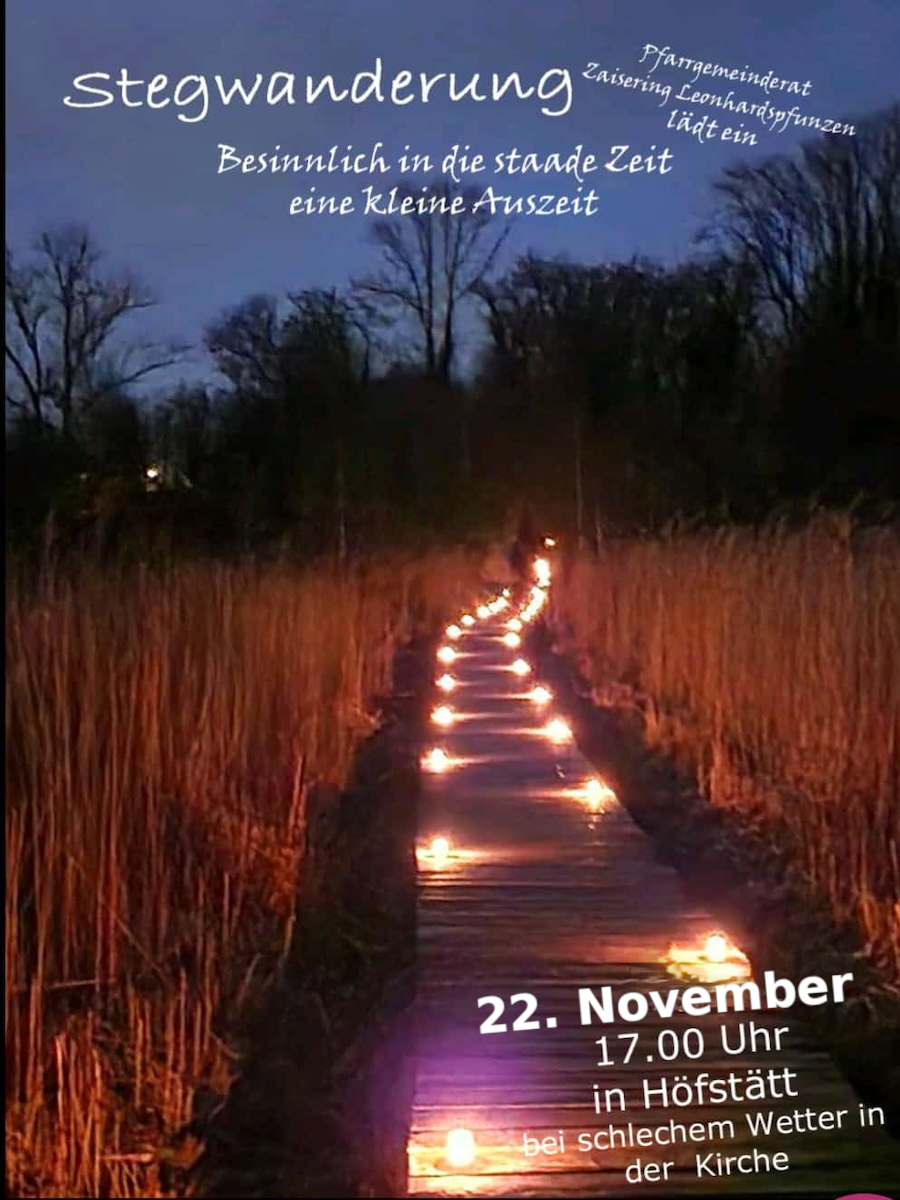 Besinnlich in die staade Zeit – eine kleine Auszeit. Der Pfarrgemeinderat Zaisering/Leonhardspfunzen lädt herzlich ein. Start ist in Hofstätt.