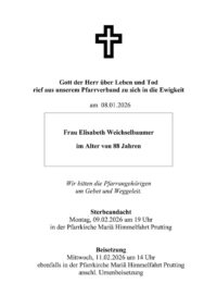 Die Trauerfeier ist dann am Mittwoch, 11. Februar, um 14 Uhr, ebenfalls in der Pfarrkirche Mariä Himmelfahrt, Prutting; anschließend Urnenbeisetzung.
