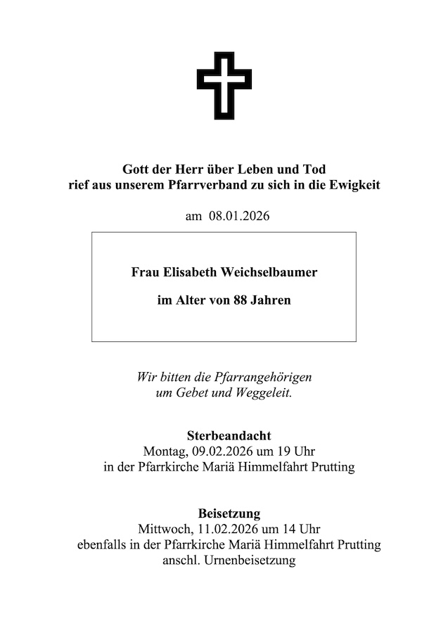 Die Trauerfeier ist dann am Mittwoch, 11. Februar, um 14 Uhr, ebenfalls in der Pfarrkirche Mariä Himmelfahrt, Prutting; anschließend Urnenbeisetzung.