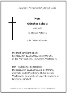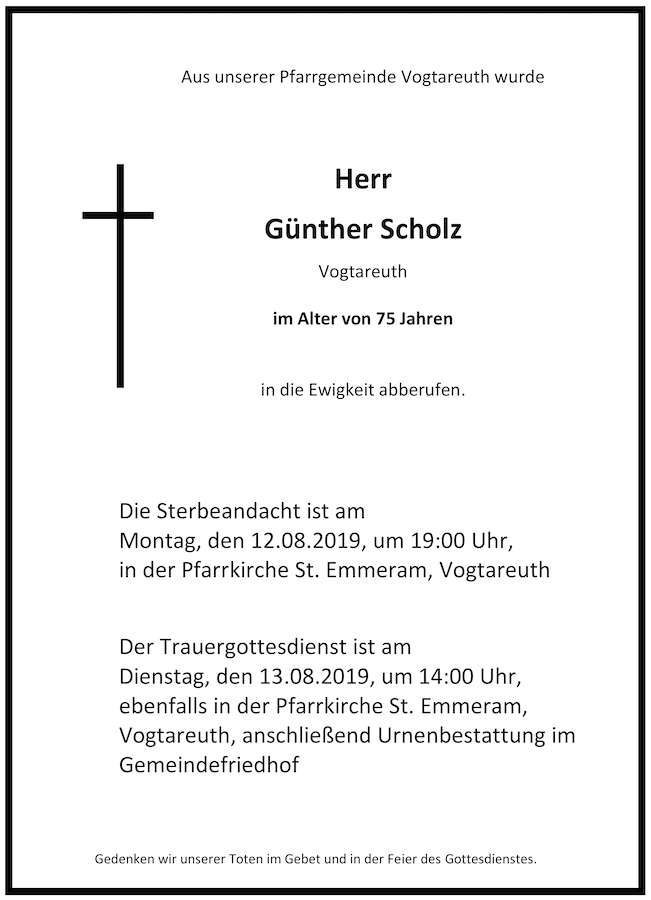 Der Trauergottesdienst ist am Dienstag, den 13. August 2019, um 14 Uhr, ebenfalls in der Pfarrkirche St. Emmeram, Vogtareuth; anschließend Urnenbestattung im Gemeindefriedhof.