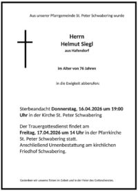 Der Trauergottesdienst findet dann am Freitag, 17. April, um 14 Uhr statt, ebenfalls in der Pfarrkirche St. Peter in Schwabering; anschließend Urnenbestattung am kirchlichen Friedhof Schwabering.