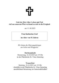 Die Trauerfeier ist dann am Samstag, 18. Oktober 2025, um 10 Uhr, ebenfalls in der Pfarrkirche St. Vitus, Zaisering; anschließend Beisetzung im Gemeindefriedhof.