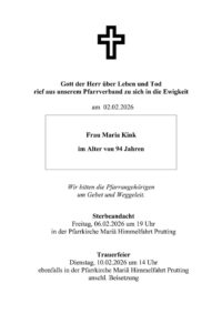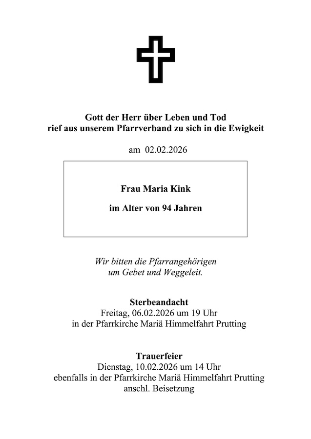 Die Trauerfeier ist dann am Dienstag, 10. Februar, um 14 Uhr, ebenfalls in der Pfarrkirche Mariä Himmelfahrt, Prutting; anschließend Beisetzung.