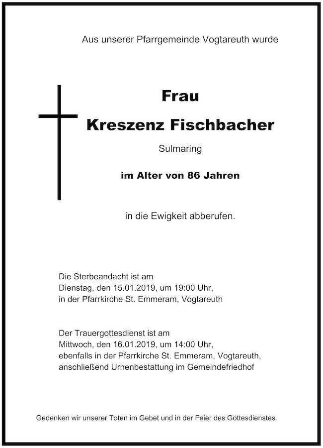 Sterbevermeldung Vogtareuth: Kreszenz Fischbacher, Sulmaring