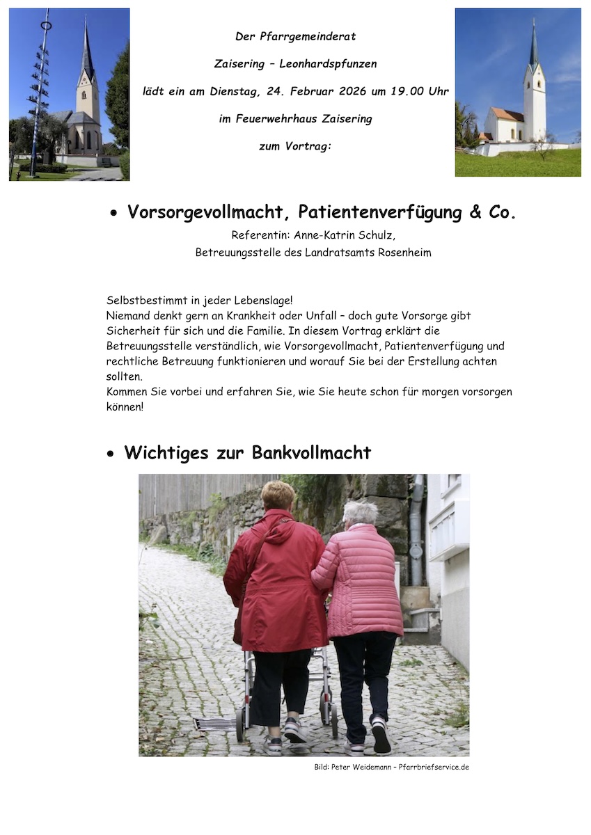 Selbstbestimmt in jeder Lebenslage! Niemand denkt gern an Krankheit oder Unfall – doch gute Vorsorge gibt Sicherheit für sich und die Familie. In diesem Vortrag erklärt die Betreuungsstelle verständlich, wie Vorsorgevollmacht, Patientenverfügung und rechtliche Betreuung funktionieren und worauf Sie bei der Erstellung achten sollten. Kommen Sie vorbei und erfahren Sie, wie Sie heute schon für morgen vorsorgen können!